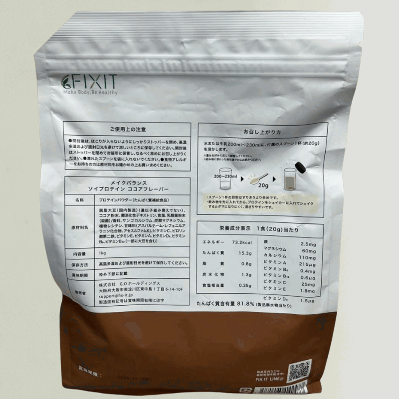 FIXITソイプロテインの栄養成分について、1回分(20g)あたりの詳細データをご紹介します。