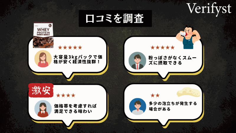 実際にベリフィスト プロテインを使用しているユーザーの口コミを詳しく分析しました。全体的に高評価が多く、特にコストパフォーマンスの良さが高く評価されています。