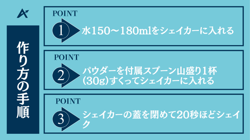 シェイカーに水または牛乳200-300mlを入れ、プロテイン30gを加えて20-30回しっかりと振ること。
